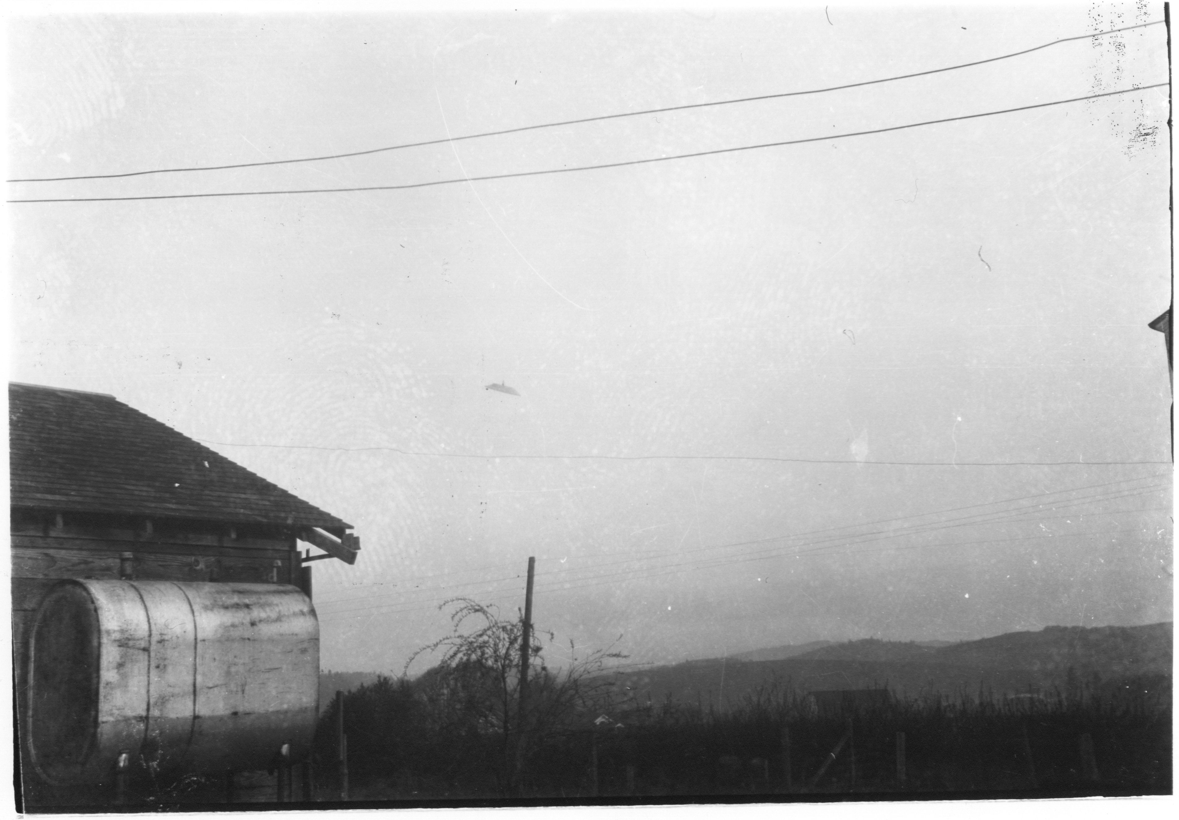 Two photographs taken by William A. Rhodes of a disc-like object over Phoenix, Arizona. Published in The Arizona Republic on July 9, 1947, these were among the first UFO photographs ever published. The Air Force attributed the object to windblown debris; others have suggested it may have been a hoax.